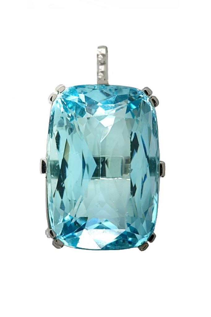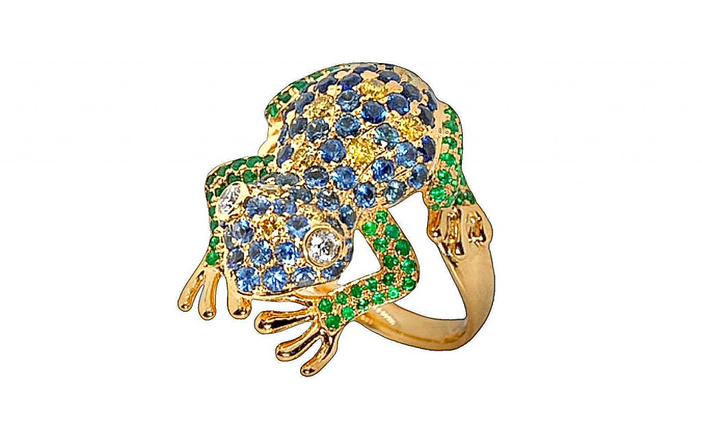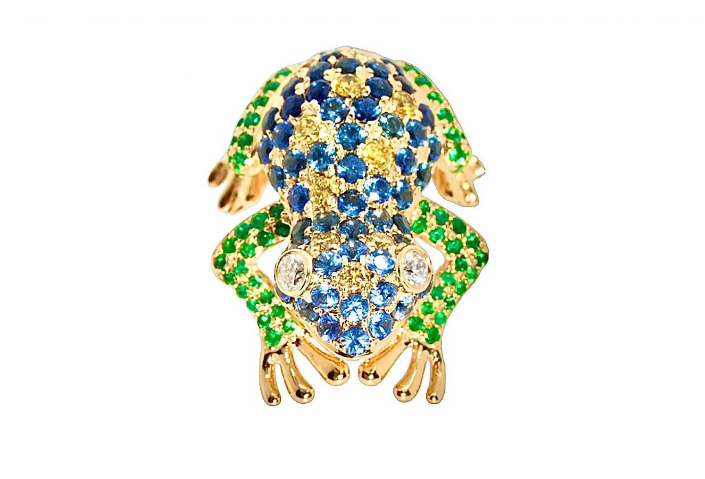 Gefertigt aus 750er Gelbgolb, besetzt mit jeweils 2 Diamanten im Brillantschliff von insgesamt 0,13 ct., 10 gelben Diamanten 0,36ct., 57 blaue Safire 2,31 ct im Farbverlauf und 98 Smaragde 0,66ct.