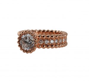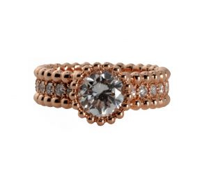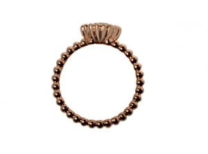 Wie eine Sonnenblume, die dem Licht folgt, entfaltet dieser handgefertigte Ring seine ganze Strahlkraft. Gefertigt aus edlem 18 Karat Roségold, umrahmt eine feine Kugelbordüre den kostbaren Mittelpunkt: einen hochfeinen Diamanten von 1,25 Carat (Farbe E, Reinheit VS1), dessen Brillanz das warme Gold leuchten lässt wie die Sonne selbst.