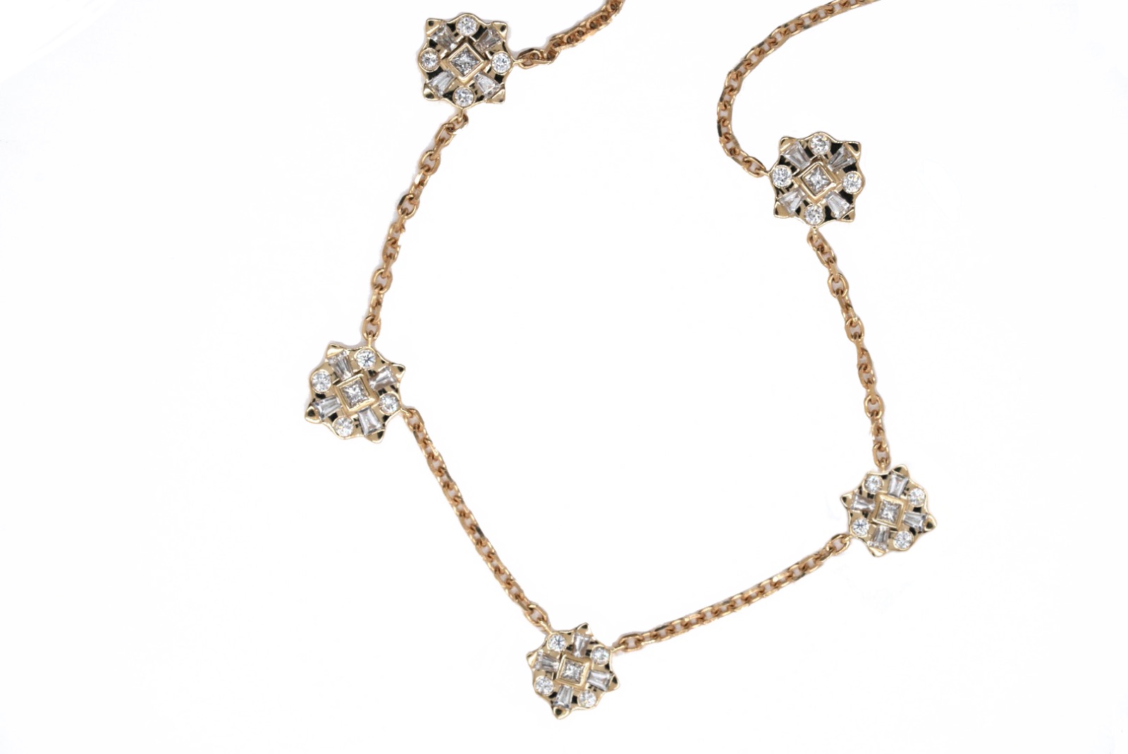 Marco Lino Collier Modell „Heavensfort“ aus 750er Gelbgold mit 20 Diamanten im Brillantschliff von insgesamt 0,51 ct., 20 Diamant Tapes von insgesamt 0,95ct., und 5 Princess Cut Brillanten von insgesamt 0,25ct. Farbe Top Wesselton F / Reinheit VS 1